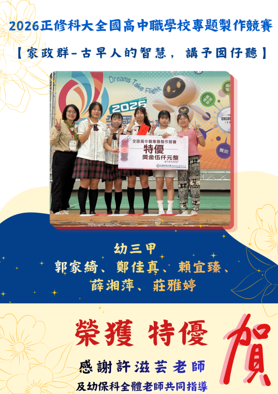 賀🎉2026正修科大全國高中職學校專題製作競賽-榮獲特優!!Post category:幼兒保育科榮譽榜Post published:2026/03/28Post author:twvstn606專題名稱:古早人的智慧,講予囡仔聽幼保三參賽同學:郭家綺、鄭佳真、賴宜臻、薛湘萍、莊雅婷 榮獲特優感謝許滋芸老師及幼保科全體老師共同指導。 Post Views: 9