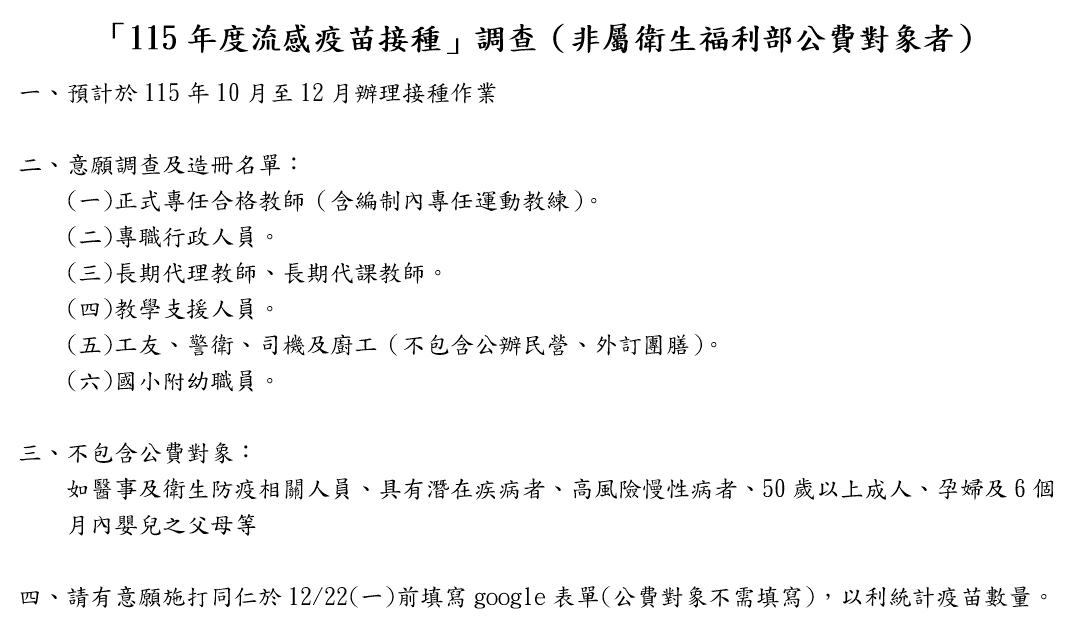 「115年度流感疫苗接種」調查(非屬衛生福利部公費對象者)50歲以下有意願施打流感疫苗的教職員請填寫此調查。 登記截止日:12/22(一)Post category:學務處公告 / 最新消息 / 置頂公告 / 行政單位公告 / 衛生組公告Post published:2025/12/12Post author:twvstn30350歲以下有意願施打流感疫苗的教職員請填寫此調查。 登記截止日:12/22(一)115年, 65年次(含 )以前的屬於流感公費對象, 不需填寫此表單網址:https://forms.gle/n5iWvZFPc8XyX5FM9 Post Views: 18