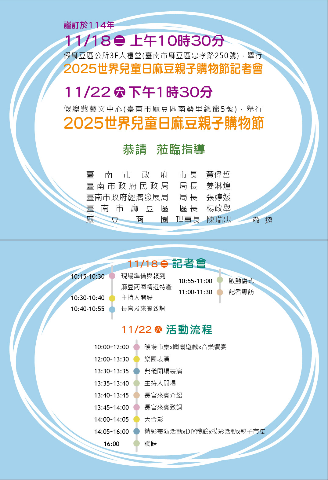 「2025年『世界兒童日』麻豆親子購物節」Post category:學務處公告 / 最新消息 / 行政單位公告 / 訓育組公告Post published:2025/11/13Post author:twvstn305活動記者會:114年11月18日(二),上午10時,假本所三樓禮堂(臺南市麻豆區忠孝路250號)。2025年『世界兒童日』麻豆親子購物節:113年11月22日(六),上午10時至下午4時,假麻豆總爺藝文中心(臺南市麻豆區南勢里總爺5號)。A10700000V0000000_0020904A00_ATTCH1下載A10700000V0000000_0020904A00_ATTCH2-1下載 Post Views: 7