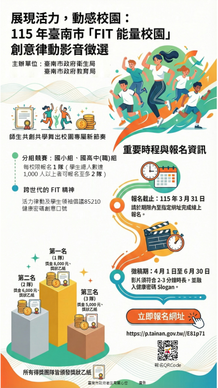 「FIT 能量校園」創意律動影音徵選Post category:學務處公告 / 最新消息 / 行政單位公告 / 衛生組公告Post published:2026/03/05Post author:twvstn303細節詳見公文及附件「FIT-能量校園」創意律動影音徵選-公文下載「FIT-能量校園」創意律動影音徵選-附件1下載「FIT-能量校園」創意律動影音徵選-附件2下載「FIT-能量校園」創意律動影音徵選-附件3下載 Post Views: 8