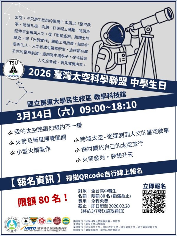 國立中央大學115年 3 月 14 日(星期六) 09:00 ~ 18:10「2026 臺灣太空科學聯盟 中學生日」活動Post category:最新消息 / 行政單位公告 / 輔導室公告Post published:2026/02/11Post author:twvstn701旨揭活動主題為「2026 臺灣太空科學聯盟 中學生日」,邀請各校教授、各企業人士來校分享;誠摯邀請貴校學生參與本次 TSU 學生日活動,期能促進不同年齡層與背景學生之間的交流與合作,並為對太空、航太及相關產業有興趣的學生提供更深入的認識與實際體驗機會。活動頁面: https://twspaceunion.org/tsu-hsd1/。即日起開放報名至額滿為止,將於 3 月 7 日發送錄取通知,報名網址:https://forms.gle/dciySAGwZKuouDMp6。A10700000V0000000_115EB00091_1_11152717378下載 Post Views: 4