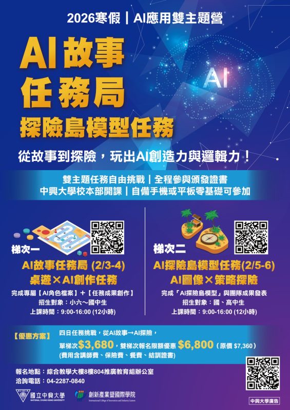- 第一梯次—AI 故事任務局(2 日營):115 年 2 月 3 日至2 月 4 日。