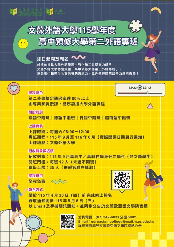 文藻外語大學歐亞語文學院辦理教育部115學年度「高級中學學生預修大學第二外語課程專班」Post category:最新消息 / 行政單位公告 / 輔導室公告Post published:2026/03/02Post author:twvstn701本學院擬申請教育部「高級中學學生預修大學第二外語課程專班」計畫,預計於115學年度開設法語、德語、日語及越南語課程專班。本專班統一採線上報名方式,報名截止日為115年4月30日(星期四),逾期不予受理,相關報名細節敬請參閱招生簡章。檢附「115學年度高級中學學生預修大學第二外語課程專班招生簡章」及宣傳海報,亦或可至本學院網頁專區查閱(https://c027.wzu.edu.tw/)。A10700000V0000000_1155000005-1下載 Post Views: 27