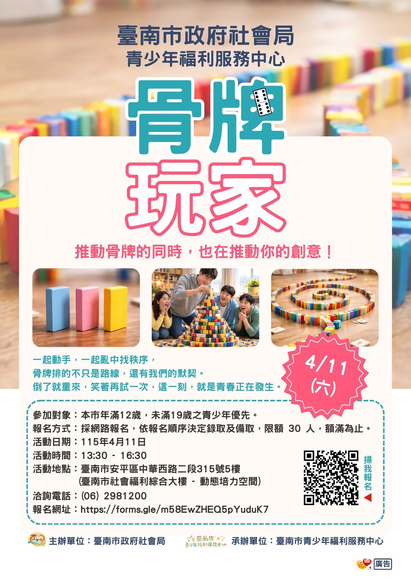 本市青少年福利服務中心「骨牌玩家」及「無人機操控體驗」Post category:學務處公告 / 最新消息 / 行政單位公告 / 訓育組公告Post published:2026/03/09Post author:twvstn305依據社團法人台灣青年社會服務推展協會115年2月25日青服推字第1150225001號函辦理。跑馬燈播放文字參考如下:臺南青少中心強勢登場!4月11日【骨牌重建挑戰】專注力全面升級;4月26日【無人機足球開戰】揪團組隊熱血對決!報名請洽06-2981200。A10700000V0000000_0308029A00_ATTCH8下載A10700000V0000000_0308029A00_ATTCH7下載A10700000V0000000_0308029A00_ATTCH6下載A10700000V0000000_0308029A00_ATTCH5下載 Post Views: 13
