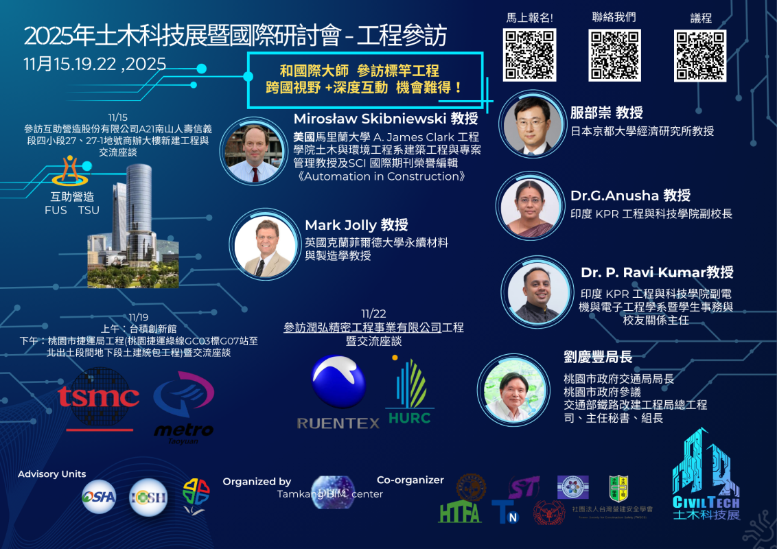跳轉至主要內容- 旨揭活動為該中心主辦之「2025土木科技展暨國際研討會」系列活動之一,與5名國際大師參與3場工程參訪,深入了解臺灣工程的實力: