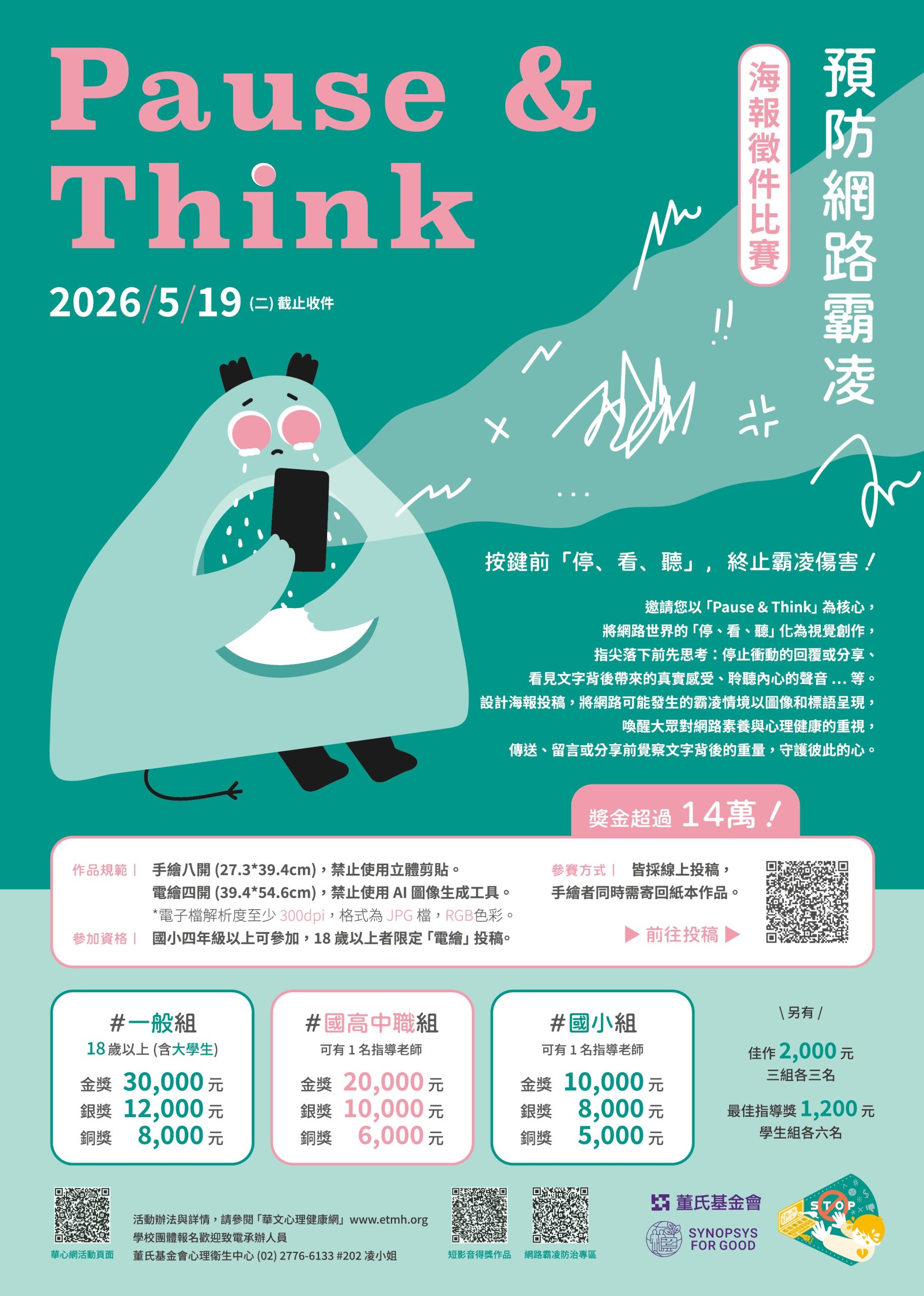 - 為提升兒童與青少年、老師及社會大眾對網路霸凌議題的重視,關心網路使用素養與心理健康的影響,本會舉辦【Pause & Think】停止網路霸凌海報徵件比賽,即日起開始收件至民國115年5月19日止,邀請學生與老師以手繪或電繪方式創作海報投稿,得獎作品可獲獎金,國小組金獎一萬元、國高中職組金獎兩萬元、一般組金獎三萬元…等,共30個獎項,總獎金超過14萬元。活動辦法請參閱https://reurl.cc/lpRGLE 。