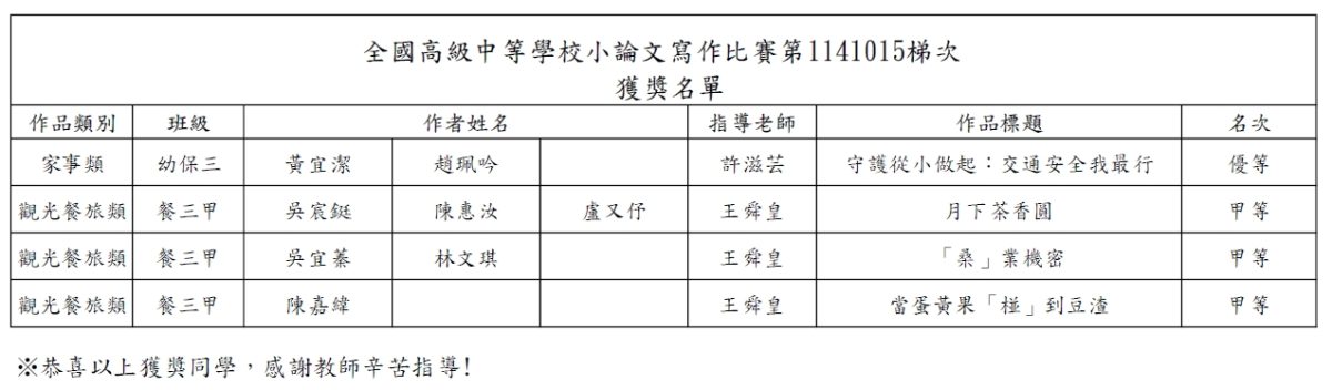 賀!!全國高級中等學校小論文寫作比賽1141015梯次獲獎名單Post category:圖書館榮譽榜 / 最新消息 / 榮譽榜Post published:2025/11/25Post author:twvstn762 Post Views: 37