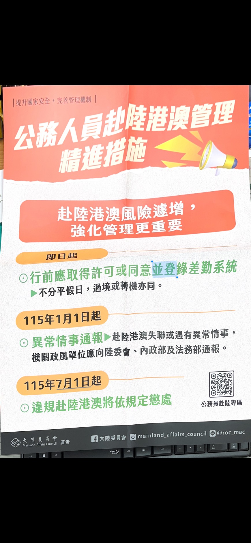 轉知大陸委員會製作之「強化公務員赴陸港澳管理機制精進 措施」宣導海報1份,請參閱~Post category:人事室公告 / 最新消息 / 行政單位公告Post published:2026/01/09Post author:twvstn104大陸委員會製作之「強化公務員赴陸港澳管理機制精進 措施」宣導海報1份公務人員赴港澳管理精進措施下載 Post Views: 15