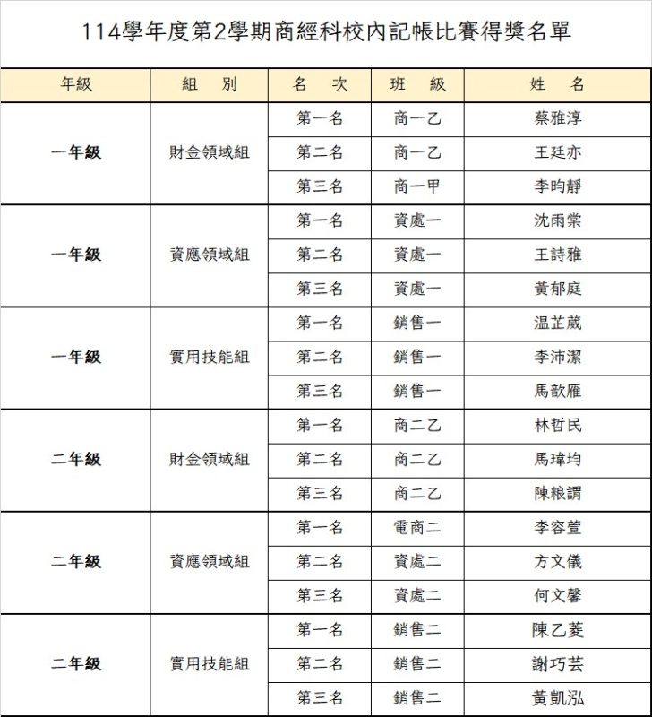 114學年度第2學期商經科校內記帳比賽得獎名單Post category:商業經營科榮譽榜 / 實用技能學程榮譽榜 / 最新消息Post published:2026/04/13Post author:twvstn604恭喜以上得獎同學。 Post Views: 21