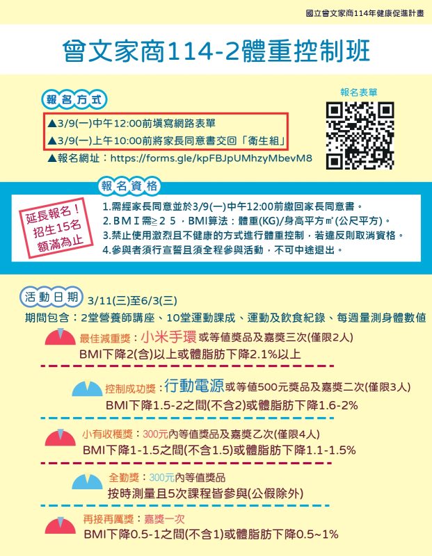 114-2曾文家商學生體重控制班報名_報名至3/9(一),最大獎為小米手環,凡參加者皆有精美獎品及嘉獎鼓勵,限15人Post category:學務處公告 / 最新消息 / 檔案下載區 / 置頂公告 / 行政單位公告 / 衛生組公告 / 衛生組檔案下載Post published:2026/02/09Post author:twvstn303限高一、高二同學參加,需填寫家長同意書繳交至衛生組。報名網址:https://forms.gle/sS4hnnjtR6fef7Cb8名額有限,已完成線網路報名+繳交家長同意書為優先114-2健康體位活動家長同意書下載114-2健康體位活動計畫書-1下載 Post Views: 92