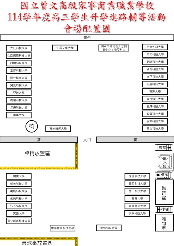1150327(五)高三學生升學進路輔導活動Post category:最新消息 / 置頂公告 / 行政單位公告 / 輔導室公告Post published:2026/03/24Post author:twvstn701參觀時間表★ 時間:115年3月27日(星期五)下午13:00~14:50★ 地點:行政大樓四樓會議室時間13:00~13:5013:50~14:50 參觀 班級餐三甲 餐三乙 電商三 銷售三 廣設三商三甲 商三乙 資處三 廣技三 幼保三備註:高一、高二班級可自由參加 Post Views: 18