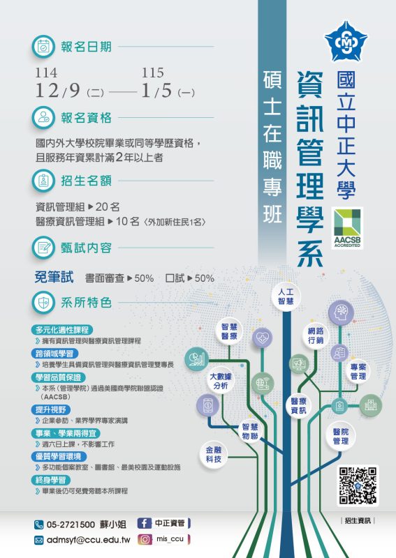 - 相關招生資訊及招生簡章請參閱 https://mis.ccu.edu.tw/p/406-1120-79674,r3231.php?Lang=zh-tw,或逕洽本班辦公室(05)2720411轉24603,承辦人:蘇小姐, E-mail: admsyf@ccu.edu.tw,隨文檢附招生海報,敬請惠予協助公告周知。