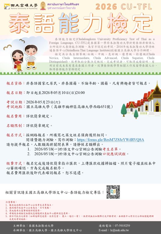 國立高雄大學與泰國朱拉隆功大學合作辦理泰語能力檢定,敬請惠予公告Post category:教務處公告 / 教學組公告 / 行政單位公告Post published:2026/03/13Post author:twvstn202旨揭檢定係泰國朱拉隆功大學詩琳通泰語中心授權本校辦理,該檢定為官方認定考試。報名日期:即日起至115年5月10日(日)24:00。考試時間與地點:115年5月23日(六)於本校(國立高雄大學)辦理。詳細簡章資訊,歡迎至官網參考:http://lc.nuk.edu.tw/。檢附考試海報如附件。A10700000V0000000_A095J0000Q115600003100-2下載 Post Views: 8