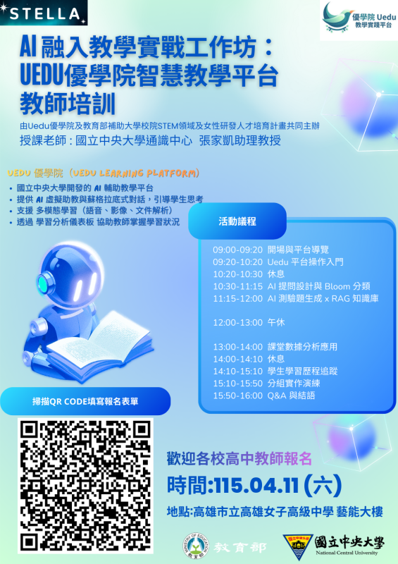 教育部「補助大專校院STEM領域及女性研發人才培育計畫」擬辦理「AI 融入教學實戰工作坊:Uedu優學院智慧教學平台教師培訓」Post category:教務處公告 / 教學組公告 / 行政單位公告Post published:2026/04/01Post author:twvstn202本活動旨在協助教師運用AI技術融入教學,提升教學效能與數位素養。活動資訊如下:活動時間:115年4月11日(星期六)。活動地點:高雄市立高雄女子高級中學。參加對象:全國高中職教師。報名方式:填寫線上報名表單(https://reurl.cc/GaxVlv)完成報名。檢附活動海報乙份,請協助公告並鼓勵貴校教師踴躍參加。承辦單位:國立中央大學資訊工程學系。聯絡方式:ncustella@gmail.com。 Post Views: 6