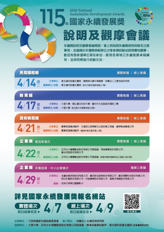 - 為增進各界對於國家永續發展獎之瞭解,並促進永續發展相關經驗互相交流與分享,行政院國家永續發展委員會另舉辦「115年國家永續發展獎說明及觀摩會議」共計5場次,均可免費線上報名,其中教育類場次資訊如下: