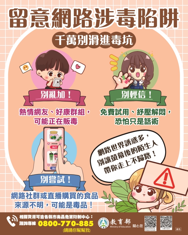 115年2月防制學生藥物濫用海報宣導Post category:教官室公告Post published:2026/02/24Post author:twvstn311115年2月防制學生藥物濫用海報宣導—留意網路涉毒陷阱 Post Views: 26