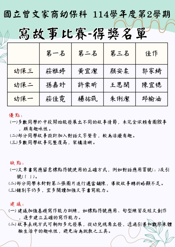 114學年度第2學期幼保科寫故事比賽獎名單Post category:幼兒保育科公告Post published:2026/03/25Post author:twvstn606 Post Views: 26