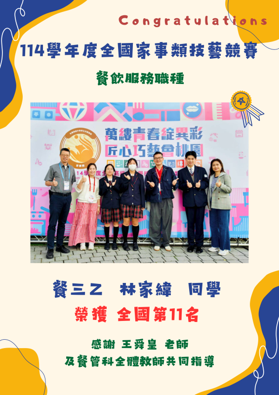 賀🎉114學年度家事類學生技藝競賽 餐飲服務組 優勝第11名Post category:榮譽榜 / 餐飲管理科公告 / 餐飲管理科榮譽榜 / 餐飲管理科競賽成果Post published:2025/11/15Post author:twvstn605114學年度全國家事類技藝競賽🥇🏅【餐飲服務職種】餐三乙 林家緯 榮獲 全國第11名感謝 王舜皇老師及餐管科全體老師共同指導👍 Post Views: 20