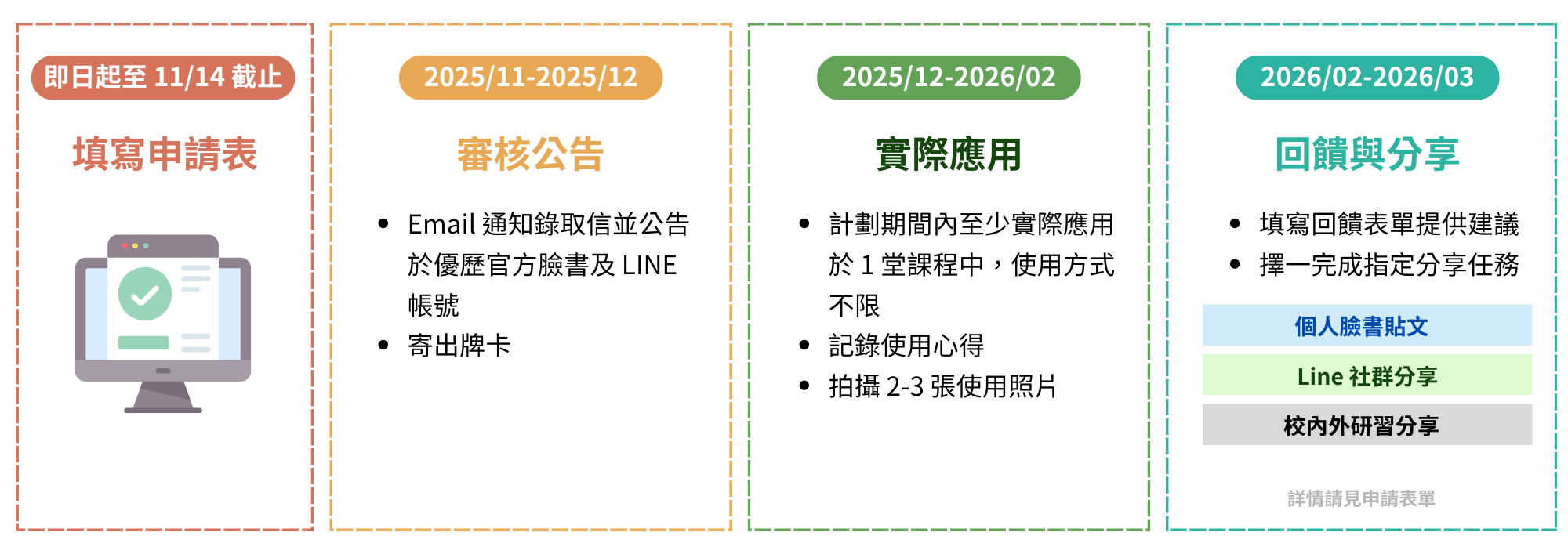 - 本牌卡提供全國高中職師長免費申請,申請者僅需提供使用回饋並完成指定任務(詳見「申請連結」所附任務與期程)。